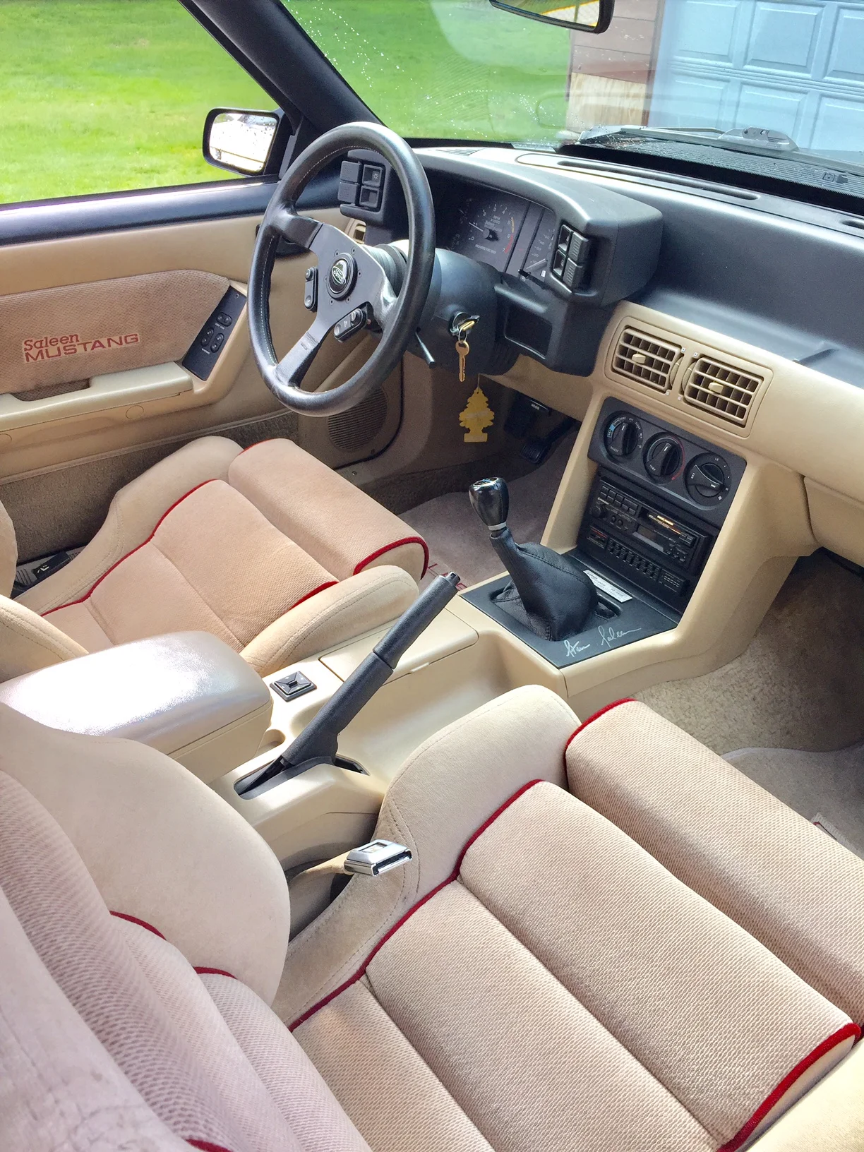 The interior was another great detail in the Saleen Mustangs, with a healthy dose of upgrades being added. The first thing you notice is the Flofit seats, replacing the lackluster factory units. The new seats offered excellent lateral support, and look right at home in the fox interior. The three spoke Momo steering wheel, leather wrapped shift knob, and custom embroidered door panels finish the look perfectly. On the console just forward of the shifter, you find the custom engraved plaque stating the year and build number of the car.