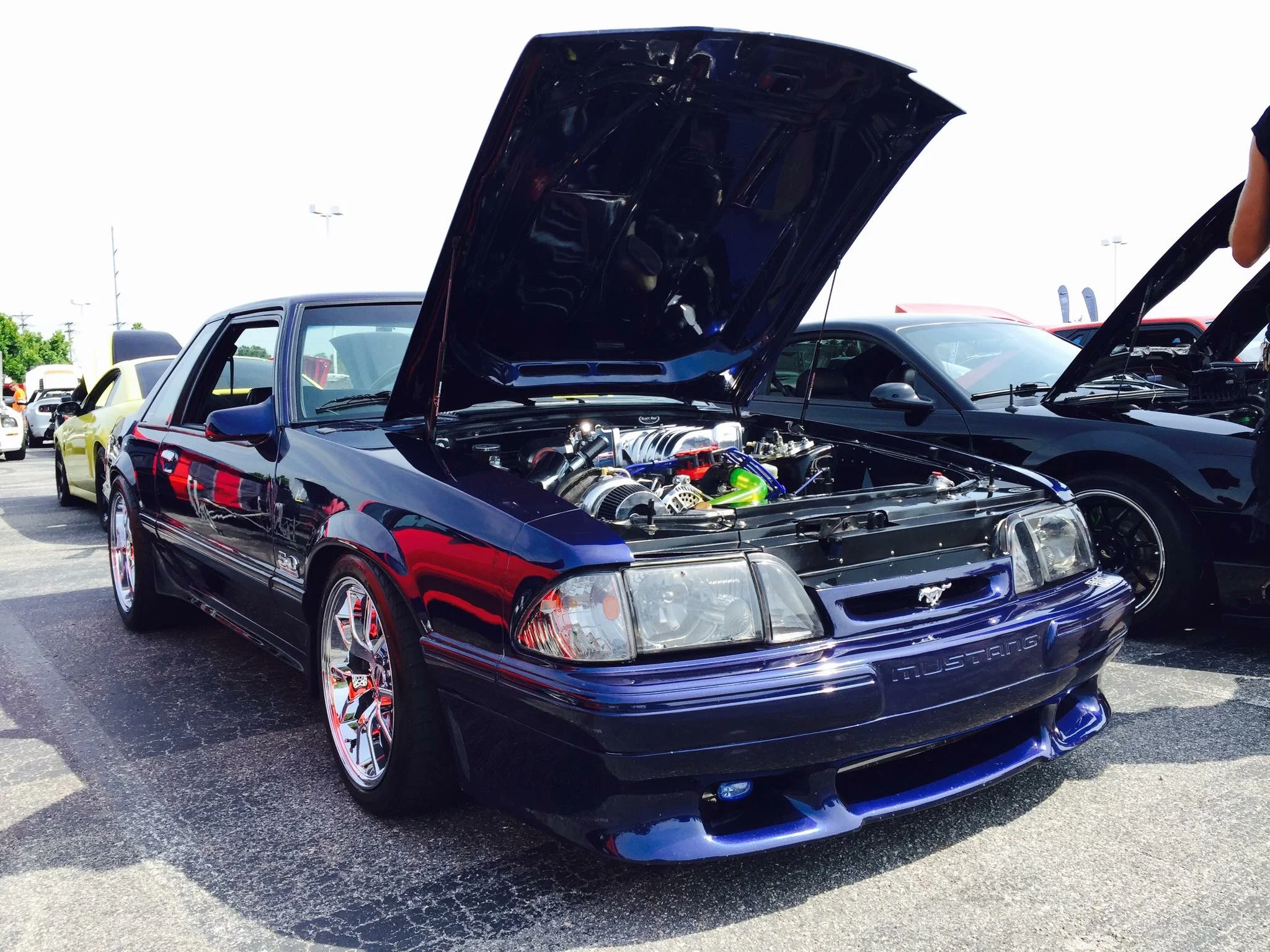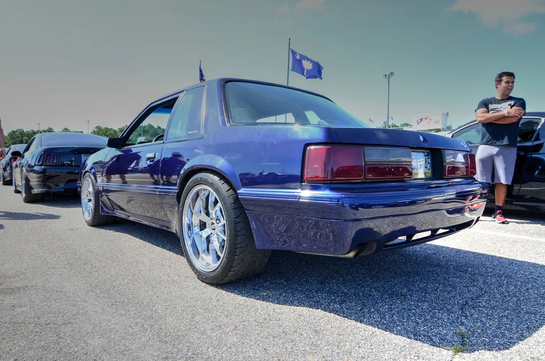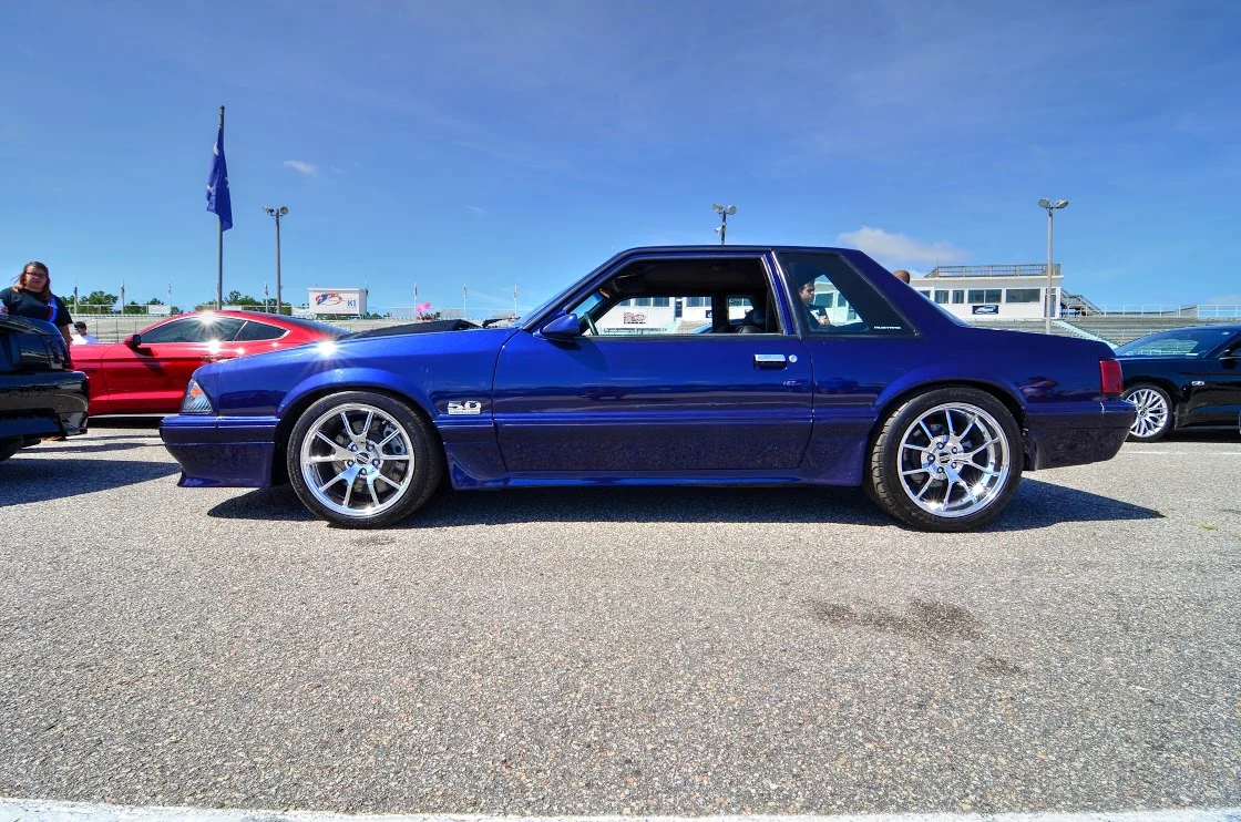 The paint and body work took the longest. Stripping away all of the old faded paint, and straightening the body was a long process. Once done, a Cervinis body kit, Cobra grill insert, and Mach 1 hood found their way onto the notch. Brian then laid down several coats of Ford Kona Blue, with black accents on the hood. Next up were a set of ultra clear headlights, and S197 5.0 badges finish off the body. For wheels, a set of chrome FR500s were wrapped in BFGoodrich rubber, which work perfectly with the clean coupe lines.
