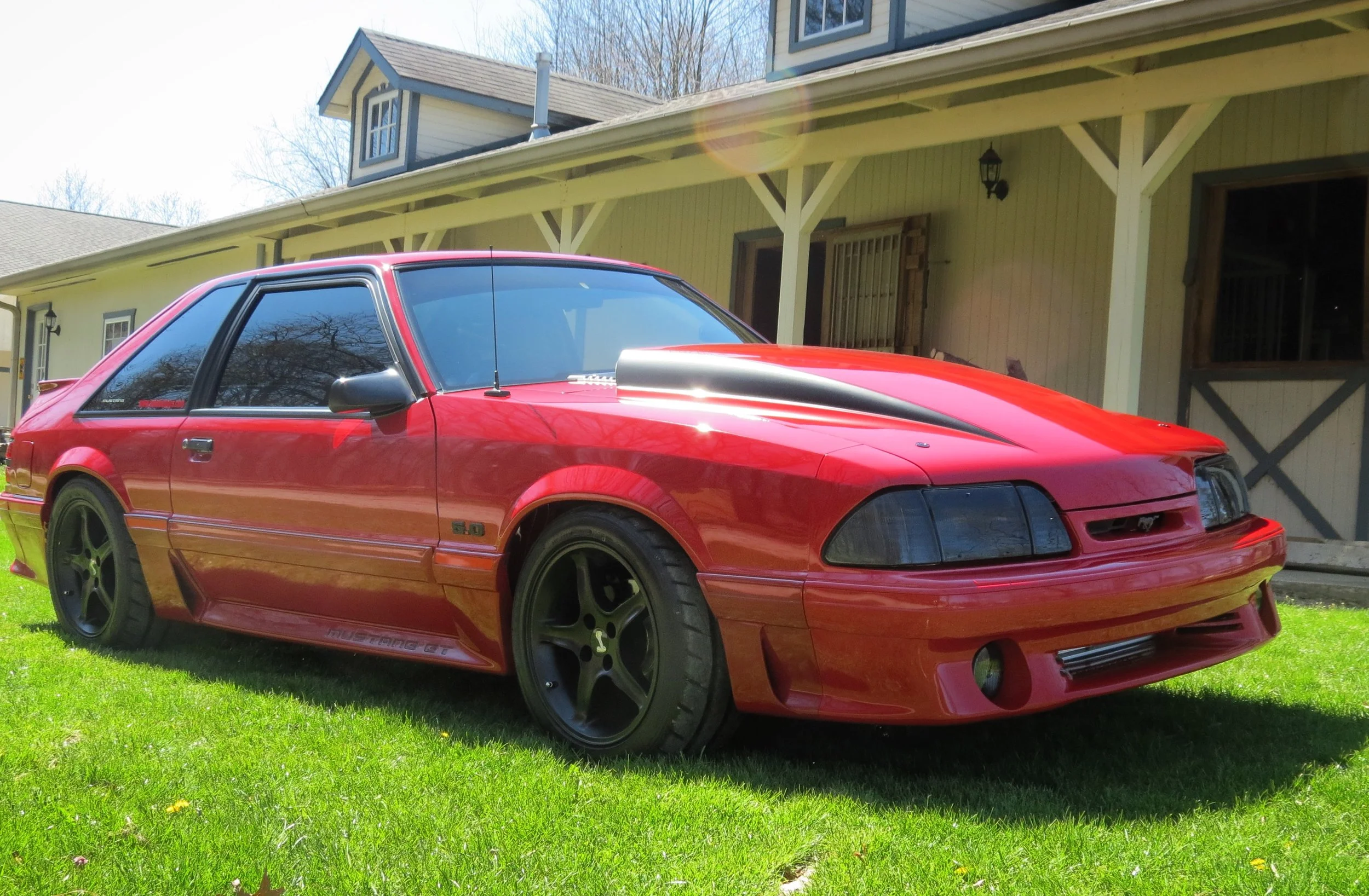 With a solid plan for what he wanted, Bryan got to work building his dream foxbody. The engine was sent of to his friend Dan to build, using all ARP hardware, including head studs. The little small block was now ready for some boost. While the engine was away, Bryan set to work totally customizing the engine bay. After a call to Scott Rod fabrication, Bryan had a set of fender apron panels, and frame rail covers. Next up, Bryan removed everything from the engine bay, and began the long and tedious process of filling in all of the holes. Once finished, the car was sent off to be sprayed in Medium Scarlet Red. After many hours of polishing the new paint, Bryan's GT was ready for reassembly.