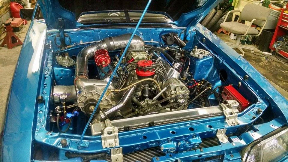 When Buddy Burney set out to build his Mustang, he had no intentions of being easy prey. Starting life as a 4cyl car, he has transformed it into the predator you see here. To get things moving, he began with a 351 Windsor block, and had it bored & stroked to 393ci. The foundations consists of a Scat forged crank, DSS billet rods, and DSS billet pistons. Moving on up, a healthy set of Edelbrock Victor Jr heads were torqued down, and an Anderson Ford blower cam was slid into place. Sitting atop the Edelbrock Victor Sr intake is a custom tuned blow-through carb, that gets force fed massive amount of atmosphere via the big Vortech. If there was ever a solid combo for big power, you are looking at it.