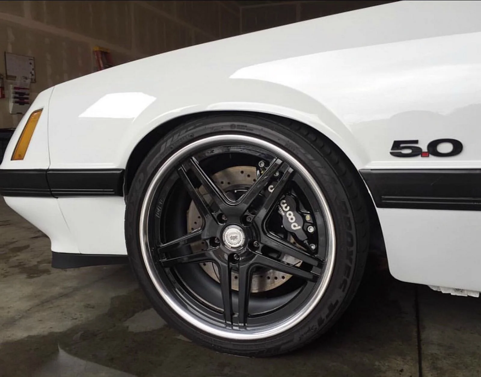 For paint and body, Moises had to start from square one. The entire car was stripped of its wares, and the long and tedious task of welding, filling, shaving, sanding, and fitting commenced. The engine bay is now completely void of the typical fox body Mustang swiss cheese. The exterior is not so crazy, however. The fresh paint, moldings, trim, and emblems all look fairly stock; why mess with success? Under the car where the Maximum Motorsport suspension, mini tubs, and the insane DPE 19" wheels reside is how Moises chose to make his statement, which he does.