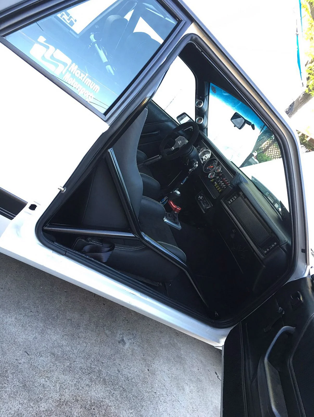 Inside is where Moises really worked his magic. The custom roll bar, aircraft style switches, suede wrapped pillars, and full bevy of AutoMeter gauges give the car a pro touring feel.