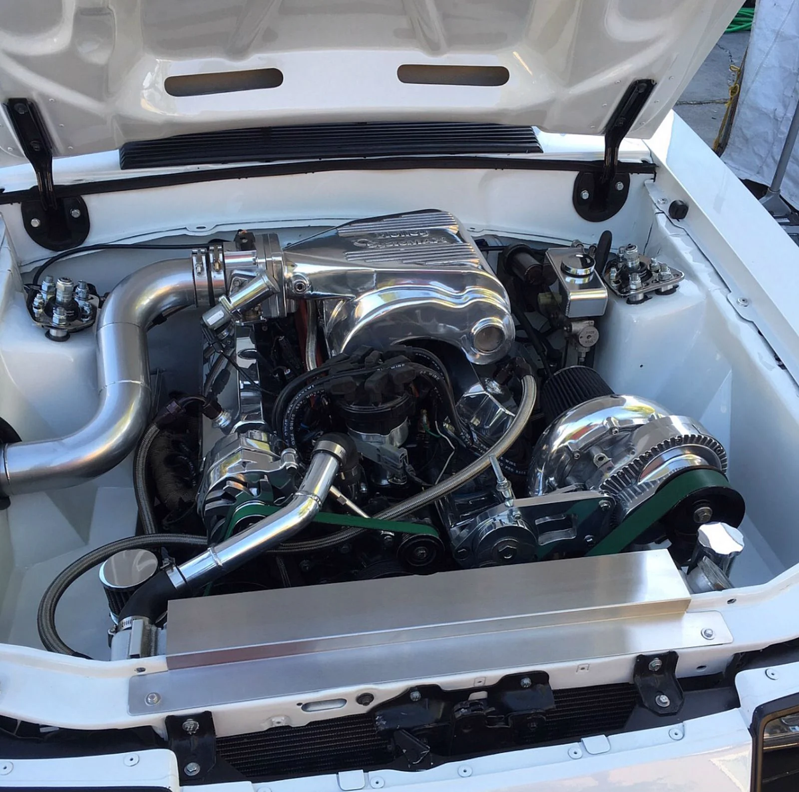 You don't need me to tell you that any old 302 simply wouldn't do inside the fresh smoothed engine bay. A Dart based 308 with a forged rotating assembly kick things off, and are complemented by World Products heads, Holley intake, and custom ground comp cam. To speed things along, a polished D1 Procharger helps push the bullet proof mill to over six hundred horsepower on pump gas. The rest of the drivetrain consists of a Tremec T56, and an 8.8 rear that's been narrowed using 9" ends.