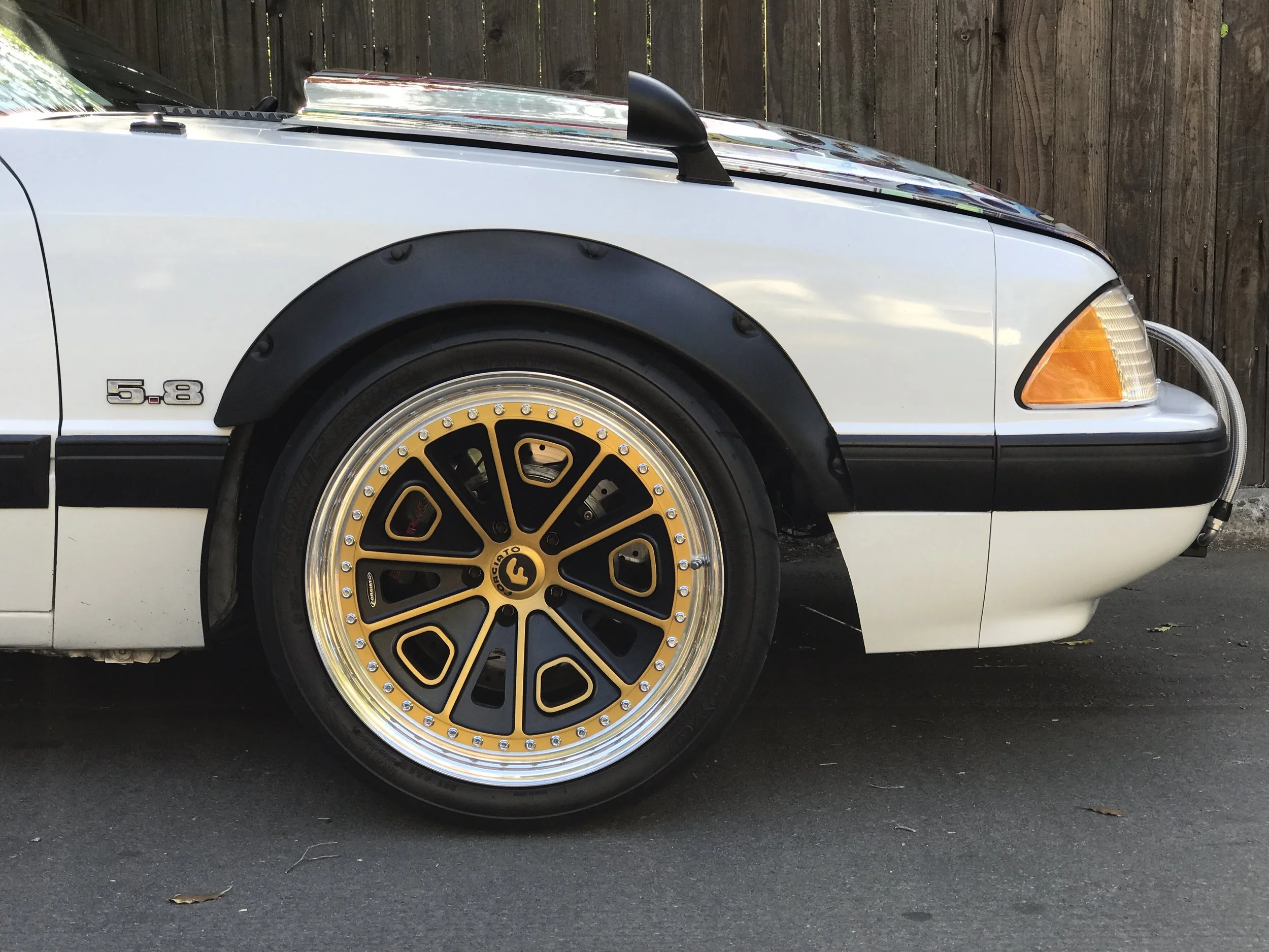 Once back home, Ron got to work totally transforming his fox body into a tribute of sorts. Securing sponsors like Bear Brakes, QA1, Cobra Seats, and Toyo tires; things began to come together. The first order of business was to graft in custom fender flares, to make room for the massive meats that would reside on the car. The wheels are Forgiato Formula Vintage series, that Ron designed himself. Formed from 7000 series forged aluminum, the wheels are ultra light, as well as strong. If you are confused by the pictures, Ron has different wheels on either side of the car. Why? Because he couldn't decide on one wheel, and he didn't have to. On the driver side, the wheels are Forgiato FV1s, which are inspired by the Ronal/AR wheels, used on Saleen Mustangs in the '90s. Size checks in at 19x10 in the front, and 19x12 in the rear; weighing just a tick over 20lbs each.