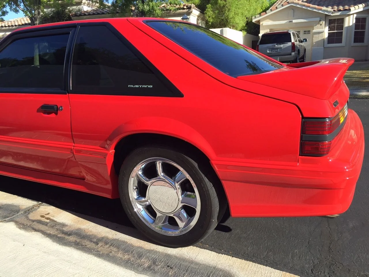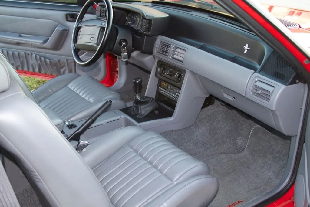 The stock theme comes to an end when you open the hood. Which even on a car this immaculate, is just fine in my book. I mean it's still a foxbody right? The previous owner set out to increase the fun factor, but maintain a level of class and originality. To accomplish that goal, the famed Cobra intake was polished within an inch of its life. Up next was the addition of a show polished Vortech V3 Si Supercharger. Complementing the blower is a turbo XS blow off valve, and an Anderson Ford Motorsport power pipe with a 7” K&N filter. The next mod was to replace the rather anemic Cobra cam with something more robust. A FRPP B303 cam was installed to give the snake a nice lope, and add few extra ponies to the party. The supporting mods include a Lightning 90mm mass air flow meter, green top 42lb injectors, and a 255LPH fuel pump.