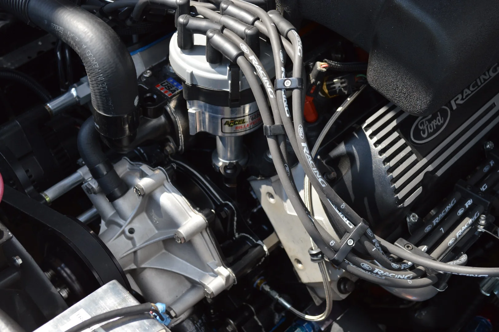 While the rules are strict in American Iron, they do allow for plenty of modifications. Up front is a SLA arrangement, with Koni coil overs, and Maximum Motorsports bump steer kit. The rear setup is a Steeda 5 link, Maximum Motorsports torque arm springs, Koni shocks, and Steeda lower control arms. The brakes are Wilwood Dynalite 4 piston calipers front and rear.